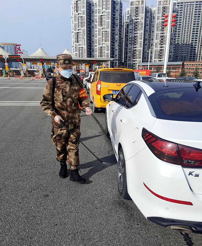 即使带着口罩,王玮的爱人梁婷还是一眼便认出了他。远远地看着他给过往车辆消毒喷药,一丝不苟。车到跟前了,王玮仍机械式地给家里的车消毒,梁婷心里思绪万千——这几天,五岁多的儿子喜宝只要看到电视里穿防护服的叔叔就喊着问里面有没有爸爸,早出晚归五六天没见上了,元宵节了,娃和老人也盼着他能回来能吃个团圆饭……除了想说的,还有很多想问的,你在这里执勤,饭咋吃的?在哪休息上厕所?晚上冷不冷?……