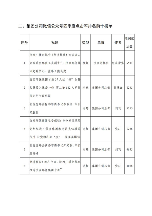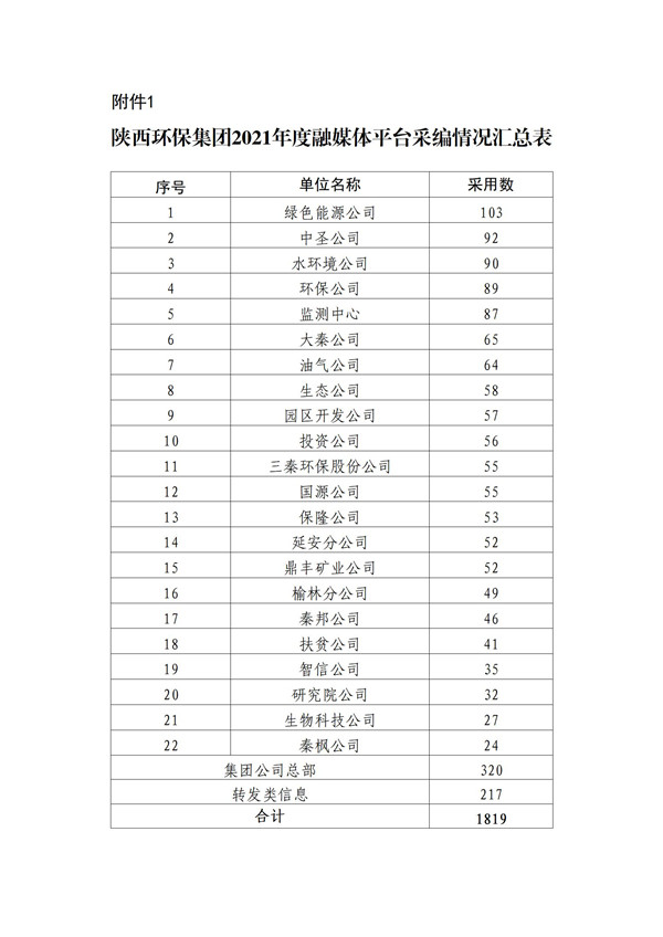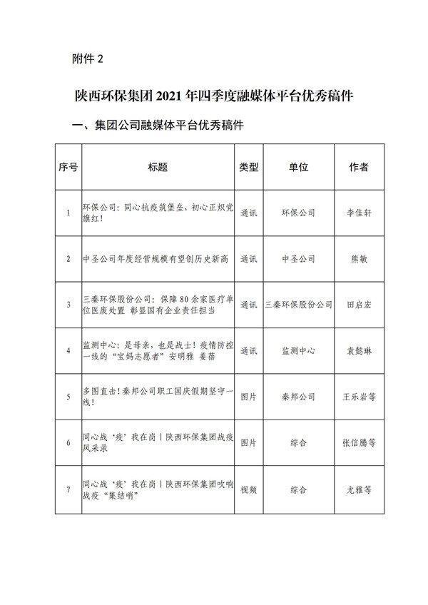 为加强集团公司门户网站、微信公众号、新浪微博、视频号等融媒体平台的稿件采编工作,鼓励广大通讯员围绕企业中心工作撰写出高质量的稿件,发挥优秀稿件的示范作用,为集团高质量发展鼓与呼,按照集团公司《关于建立政务信息采用情况通报和优秀稿件评选制度的通知》(陕环司函〔2021〕31号)文件要求,现将2021年度集团公司融媒体平台稿件采用及2021年四季度优秀稿件评选情况通报如下: