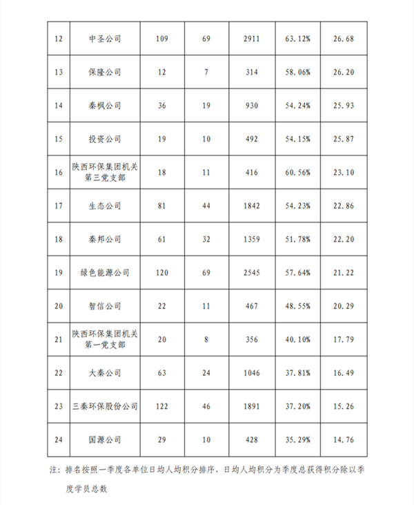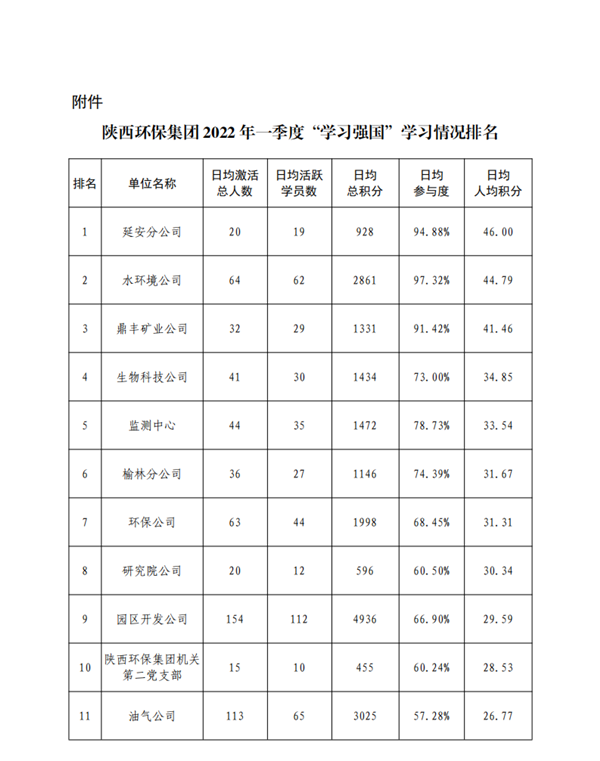 一季度,陕西环保集团整体平均参与度为60.39%,日均人均积分26.42分,日均活跃学员数804人。从学习情况统计来看,部分排名较后的单位对“学习强国”平台重视程度不够,已注册的干部职工学习参与度较低,学习积极性不高,日均学习积分偏低,低分人数较多。希望排名靠后的单位要切实提高政治站位,把组织干部职工使用“学习强国”平台开展学习作为一项重要政治任务,加强干部职工的日常学习,从每日参与度和学习积分入手,抓好学习管理工作,增强干部职工理论知识水平,努力形成“比、学、赶、超”的浓厚学习氛围。
