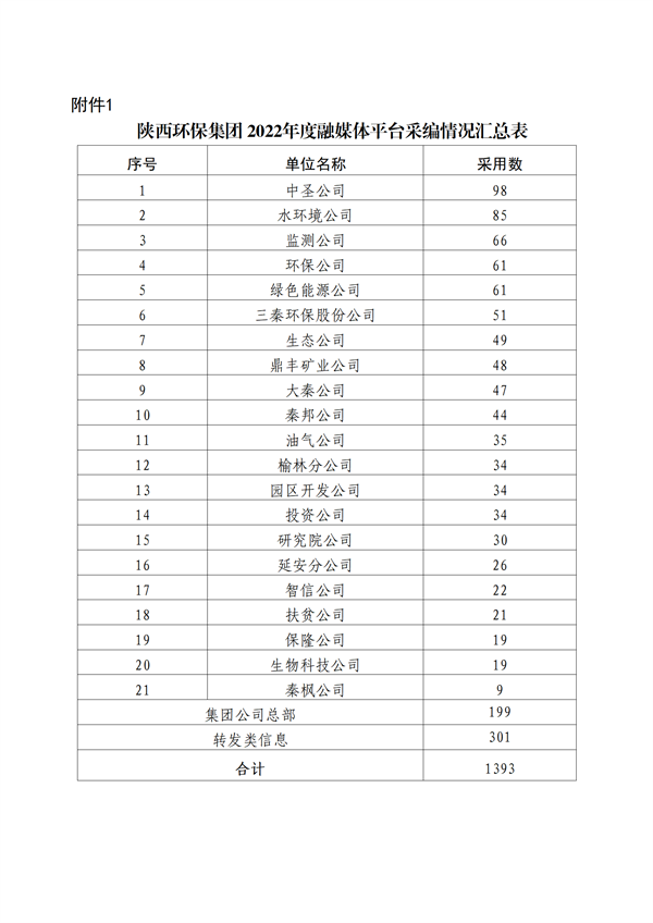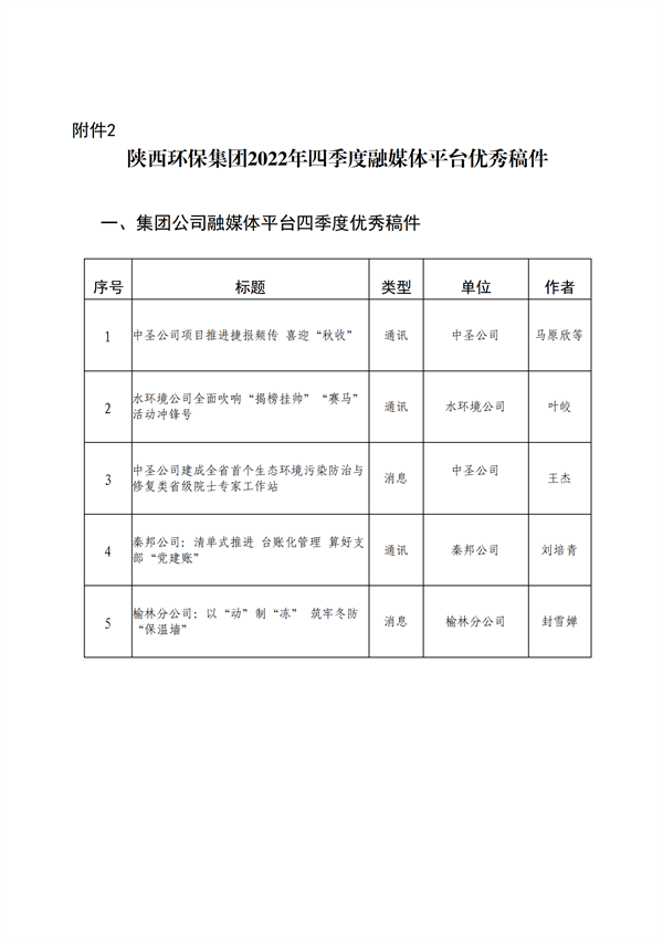 为加强集团公司门户网站、微信公众号、新浪微博、视频号等融媒体平台的稿件采编工作,鼓励广大通讯员围绕企业中心工作撰写出高质量的稿件,发挥优秀稿件的示范作用,为集团高质量发展鼓与呼,按照集团公司《关于建立政务信息采用情况通报和优秀稿件评选制度的通知》(陕环司函(2021〕31号)文件要求,现将2022年度集团公司融媒体平台稿件采用及2022年四季度优秀稿件评选情况通报如下: