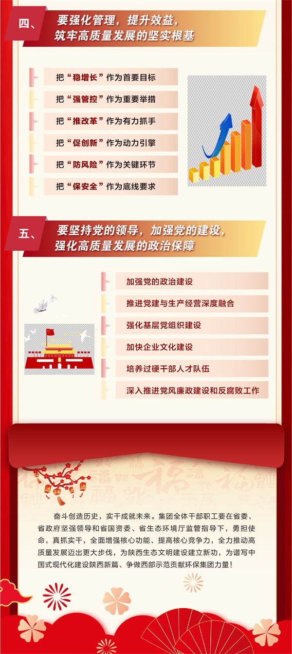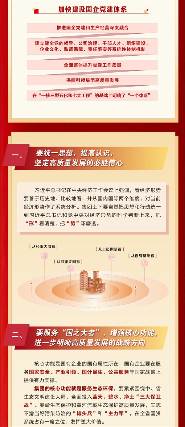 就进一步做好集团2024年工作,郝军亮提出五个方面意见:一是统一思想,提高认识,坚定高质量发展的必胜信心。要正视困难、直面问题,坚定信心、保持定力,大幅化解存量问题,有效遏制增量问题,全面提高合规管理水平,促进稳健经营,推动高质量发展。二是服务“国之大者”,增强核心功能,进一步明晰高质量发展的战略方向。要聚焦“服务生态环保”这一核心功能,紧紧围绕中、省生态文明建设大局,全面投入蓝天、碧水、净土“三大保卫战”、秦岭生态保护、黄河流域生态保护和高质量发展,矢志不渝当好污染防治的“排头兵”和“主力军”,在全省国资系统占有一席之位、发挥更大价值。三是补短板、强弱项,提高核心竞争力,厚植高质量发展的核心优势。要突出“科技、效率、人才、品牌、模式”五个关键,加快补齐短板、强化弱项、锻造综合优势,努力提升核心竞争力。四是强化管理,提升效益,筑牢高质量发展的坚实根基。要把“稳增长”作为首要目标,把“强管控”作为重要举措,把“推改革”作为有力抓手,把“促创新”作为动力引擎,把“防风险”作为关键环节,把“保安全”作为底线要求。五是坚持党的领导,加强党的建设,强化高质量发展的政治保障。要通过加强党的政治建设,推进党建与生产经营深度融合,强化基层党组织建设,加快企业文化建设,培养过硬干部人才队伍,深入推进党风廉政建设和反腐败工作等举措,服务保障党中央重大决策部署和省委、省政府工作要求在集团落实落地,以实干实绩拥护“两个确立”、做到“两个维护”。