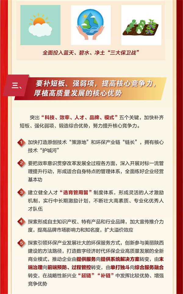 周建新要求,一要聚焦美丽中国先行区建设兴产业树样板。围绕秦岭、黄河、南水北调中线工程水源地“三大生态屏障”,在打造美丽中国先行区陕西样板上求突破,树立可示范可推广的典型,努力把美丽陕西建设推到一个更高的水平。二要聚焦突出生态环境问题抓治理求突破。强化创新意识,始终站在环保科技的前沿阵地,聚焦关中大气治理、危险废物处置、地下水保护等突出生态环境问题,深化国企改革,整合优势资源,优化产业布局,不断提升企业创新力、核心竞争力、品牌影响力。三要聚焦重点治理项目建设严管理提质效。坚持问题导向、目标导向、结果导向,聚焦全省区域流域突出生态环境问题和生态环境保护重点任务,以实现经济效益和生态效益“共赢”为切入点,严格管理项目,提升治理效果,打造样板工程,以优质项目支撑全省高质量发展和高水平保护。