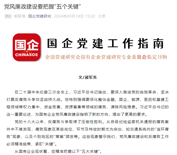 日前出版的《国企》杂志刊发了陕西环保集团党委书记、董事长郝军亮同志文章《党风廉政建设要把握“五个关键”》。现刊载如下,以飨读者。