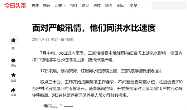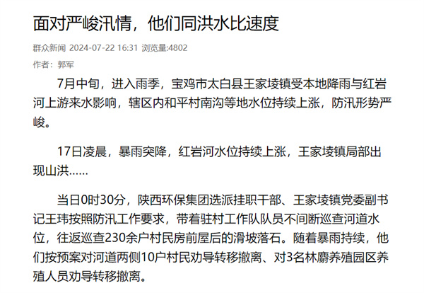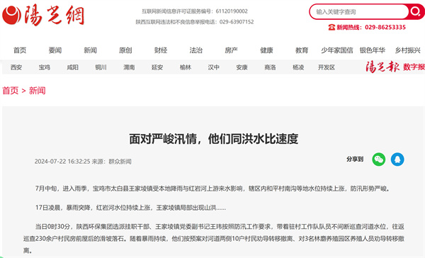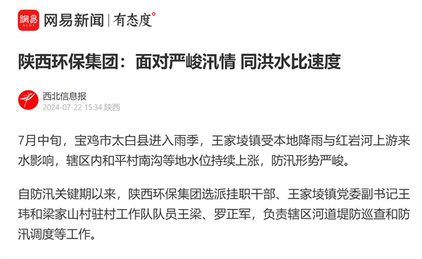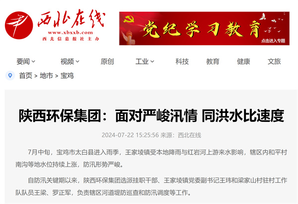 近日,学习强国、陕西日报-群众新闻网、阳光网、华商二三里等主流媒体对“七下八上”防汛关键期以来,陕西环保集团选派挂职干部、驻村工作队队员积极服务辖区防汛抗洪等工作情况进行了报道,有力展示了集团职工闻令而动、挺身而出,勇挑重担、冲锋在前的良好风貌。现集中刊载如下,以飨读者。